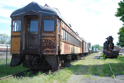 Conrail maintenance-of-way car 45907, ex. Penn Central 4573, nee New York, New Haven & Hartford grill-dining car 953 built by Pullman-Standard in 1949. It was a less-formal alternative to the full dining cars and twin-unit diners that many railroads owned. When owned by Conrail, it served as part of the wreck train in Selkirk, New York and donated by them in 1997.
