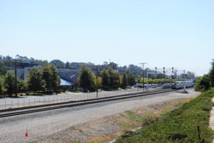 A few minutes later, Pacific Surfliner 763 bound for Los Angeles came by our location. We returned to the car and drove east of Los Alisos Boulevard, turned right on Jeronimo Road and after crossing Alicia Parkway, turned right into the Gateway Shopping Plaza and parked. We walked out onto the Alicia Parkway bridge over Metrolink's San Diego Subdivision. A phone call to Amtrak told us that Pacific Surfliner 564 was cancelled, as was Pacific Surfliner 573 so we set up for Pacific Surfliner 565.