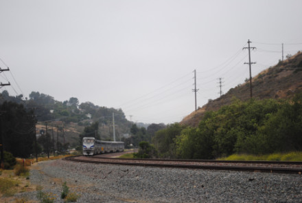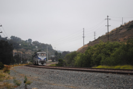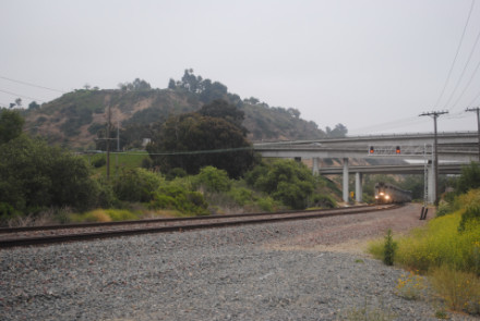 Pacific Surfliner 564 for San Diego came through next. From here we switched photo locations and stopped at one but I did not like it so we moved on and drove along Moreno Boulevard and spotted the bridge over Claremont Boulevard. We turned left on Ingulf Street then left on Denver Street and another left on Claremont Drive where we parked and walked out onto the bridge.