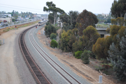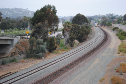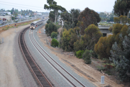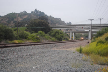 Coaster 638 heads to the Santa Fe station in San Diego and I went down and under the tracks, finding AC Adam who just arrived. We went out to Pacific Highway north to Sea World Drive, to Interstate 5 north to Mission Bay Drive, to Santa Fe Street which we took to where it ended and parked. From here we walked along the bicycle trail to just north of Elvira where I set up for my first train, which did not take long to arrive.