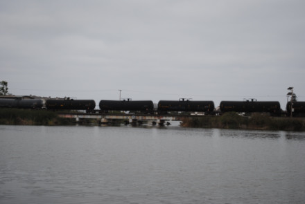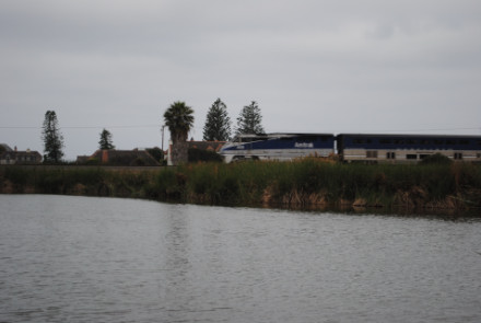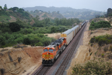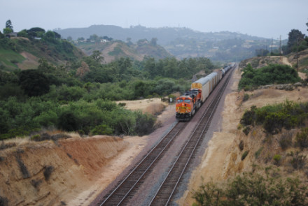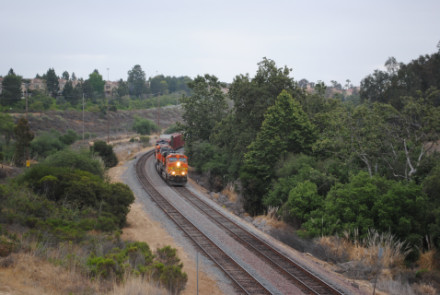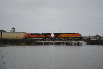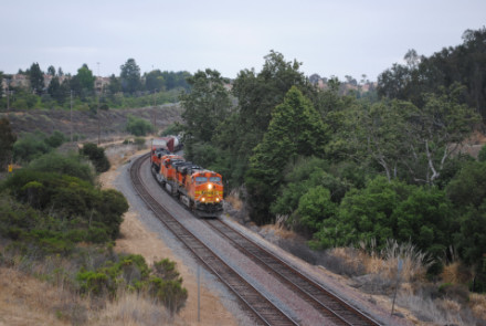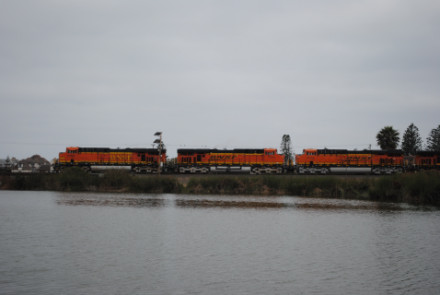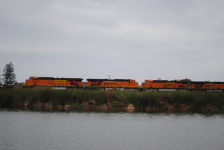 Bill Compton and his daughter Maryann picked me up at 5:50 AM sharp and we headed for San Diego County down Interstate 5. As we were travelling south, we came across a red signal telling us we were catching up to something. We neared Stuart Mesa and found a southbound BNSF freight heading for San Diego so exited Interstate 5 at Cassidy Street in Oceanside then turned left onto Carlsbad Boulevard and just after the Buena Vista Lagoon highway bridge, we parked and would be here until Pacific Surfliner 763 went through. We met two fishermen and then heard the horn of our BNSF freight so set up for our pictures.