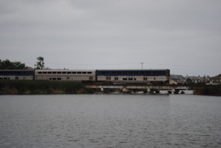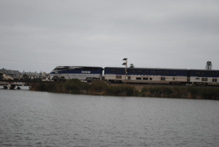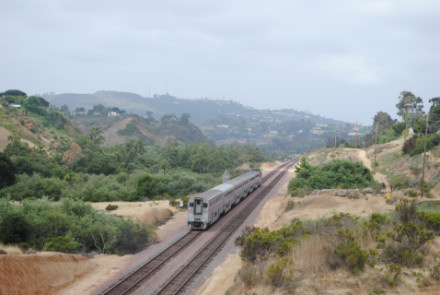 Coaster 684. Bill and Maryann found me and we headed north through Solana Beach to a Mexican restaurant parking lot at the San Elijo Lagoon to catch Pacific Surfliner 768.