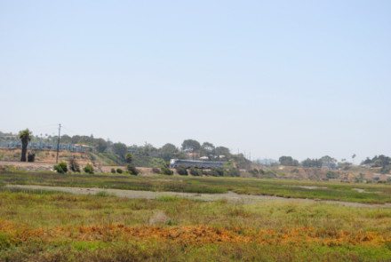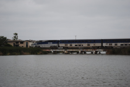 Pacific Surfliner 768 at the San Elijo Lagoon. From here we fought heavy traffic on Interstate 5 to Oceanside Harbor Drive to Harbor Drive South, then went under the mainline to a free parking lot east of the tracks. We walked out onto the north riverbank of the San Luis Rey River and set up.