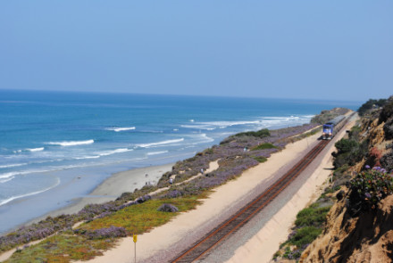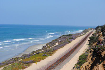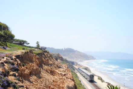 Pacific Surfliner 769 for Goleta came under Miramar Drive. From here we went west on Miramar Drive to Interstate 905 North to Interstate 5 North to Carmel Valley Road, stopping at a local store for snacks. I called Let's Talk Trains before we went to Coast Highway north to 4th Street in Delmar and parked on Strafford Street. As I walked over to the cliff overlooking the tracks and the Pacific Ocean, I heard Coaster 681 for Oceanside. We walked south to our photo location.