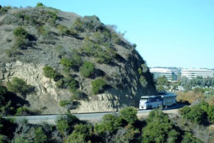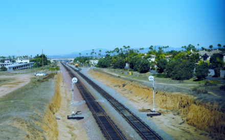 The two sides of San Clemente Pier. The train proceeded to Oceanside and I bought my Coaster ticket to Old Town then boarded the cab car on Coaster 638 and had a quick trip, where I detrained. I went under the main line and came to the parking lot where AC Adam picked me up and we headed north to Interstate 5, California 52 and Interstate 805 to Mira Mesa Boulevard, on which we made our way to Nancy Ridge Drive, went up the hill and parked. I walked back down the road for a clear view of the railroad.