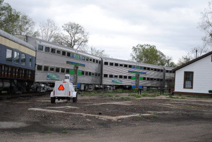 Two of the six former Metra (originally Chicago, Burlington and Quincy) bi-level cars in the Great Lakes Central yard for the proposed Detroit to Ann Arbor service.