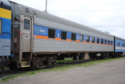 BOMX coach 147, ex. Baltimore and Ohio Railroad Museum {long-term lease since 2005}, exx. MARC 147, exxx. SEMTA 107, exxxx. Penn Central 1513, nee Pennsylvania Railroad streamlined sleeper "Norristown Inn" 8275 built by Budd in 1949. It was built into a coach in the 1960s.