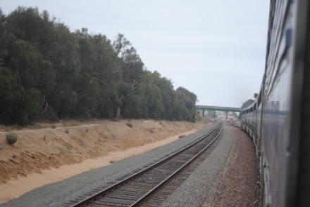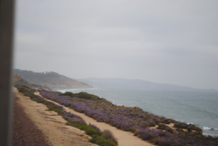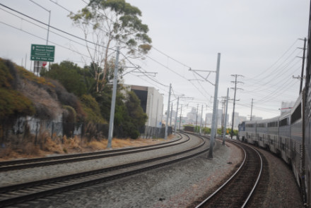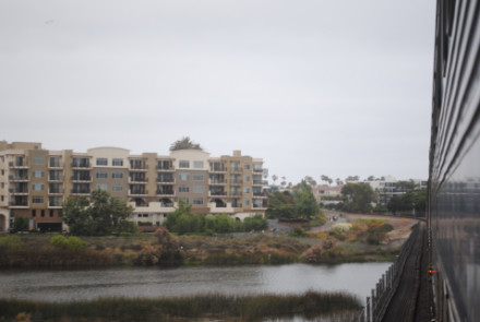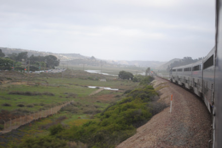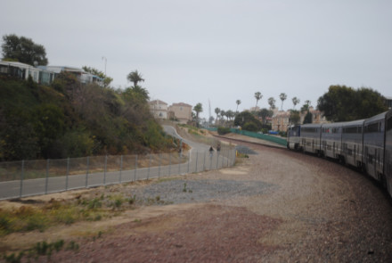 Curving into Oceanside. I returned inside but later went back otuside as the train was travelling along the Del Mar Bluffs.