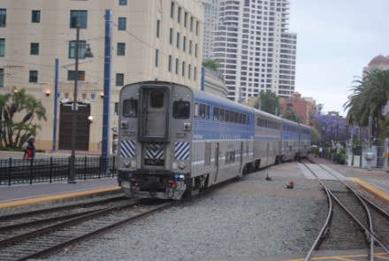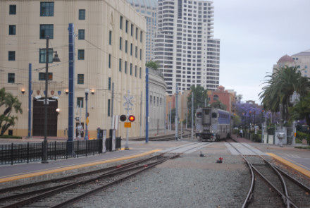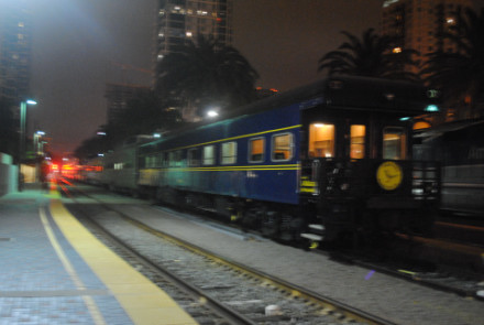 From Old Town, we ran beside the San Diego Trolley and passed a Coaster train heading to Oceanside. We arrived into San Diego on time and after the passengers had all detrained, our cars were spotted at the south end of San Diego station.
