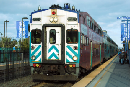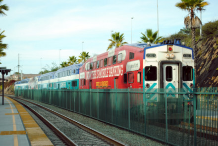 Pacific Surfliner 562 arrived and I sat in a Superliner coach for my trip to Oceanside, reading Trains Magazine on the way. At Oceanside, I detrained and went to the Coaster ticket machine to buy my ticket to the Carlsbad Poinsettia stop then walked over to wait for the train.