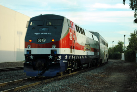 Pacific Surfliner 579 departed and I returned to the car and was heading home when I crossed Santa Ana Boulevard on Santiago Street when on the rear of Pacific Surfliner 580 was Amtrak 42, the Veterans Unit, so I made a quick U-turn and found a place to park south of the station before walking over to the southern end of the Santa Ana station platform from some pictures.