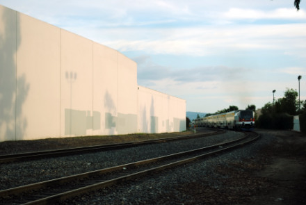 Pacific Surfliner 564 came in to do its station stop at Santa Ana with the Troop Train cars on the rear. I walked down to ground level, down the tracks south of the platform and past the fence between the tracks to have a better view of the train.