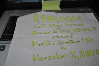 The Saturday before, I took Amtrak to Oceanside then made a round trip on the Coaster to San Diego then Metrolink home. The following day, it was Amtrak south to Oceanside then Metrolink to Orange, back to Oceanside and back to San Diego. On Monday, it would be Amtrak Pacific Surfliner 572 to San Diego then Pacific Surfliner 583 back, and at Oceanside Boulevard when the train crossed it at MP 227.2, I would be at the 1,400,000.0 rail mile.