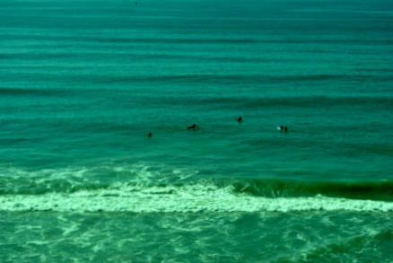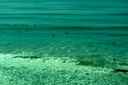 Surfers out in the water along the Del Mar Bluffs.
