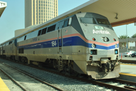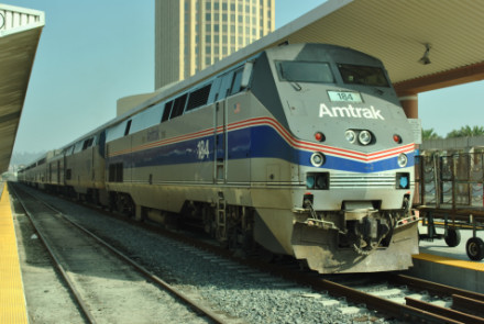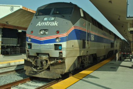 Amtrak Heritage Unit P42DC 184, built by General Electric in 2001, in its 40th Anniversary paint scheme, at Los Angeles.