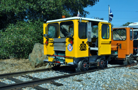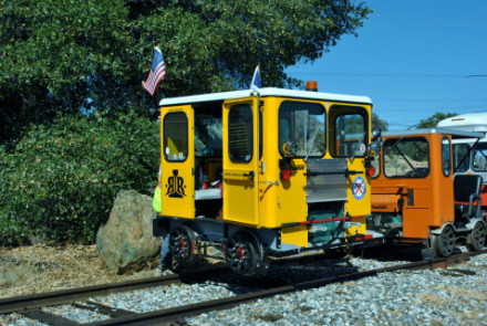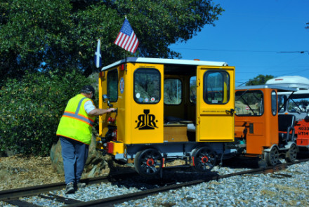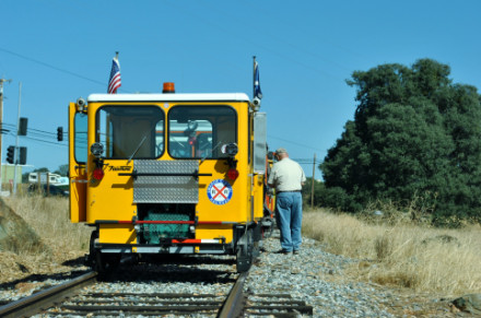 We had reached the end of track just short of the next grade crossing of CA Highway 88 just west of Martell. They had a Hot Dog truck meet us and I had a Jumbo Hot Dog, chips and Mug Root Beer then watched the turning of the speeders on the pad the group had installed at the end of the railroad.