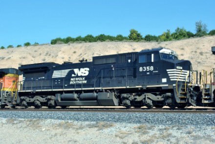 BNSF 5407 East with NS C44-8W 8358 and CSX ES44AH 3153 at Bena. This train stopped shortly after this picture so we moved to Sandcut and waited there for him to pass below us.
