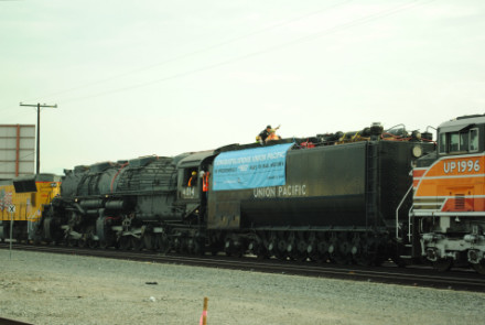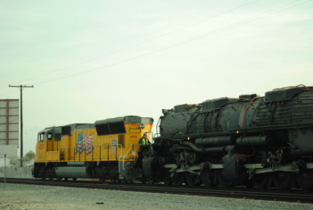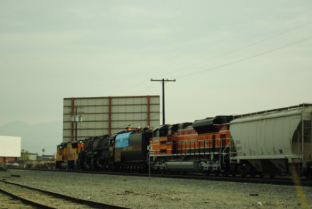First a Union Pacific westbound freight arrived to switch out cars then when they were finished, the crew was out on the front of their locomotive waiting for Union Pacific 4014 to pass by. We then saw the train coming slowly our way.