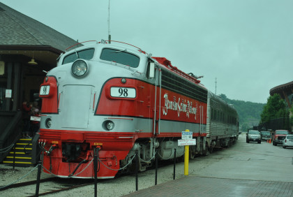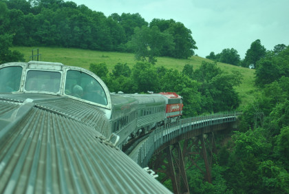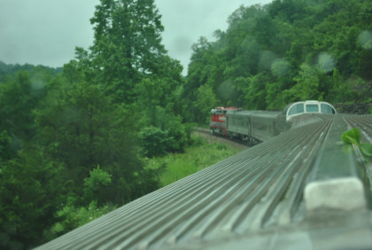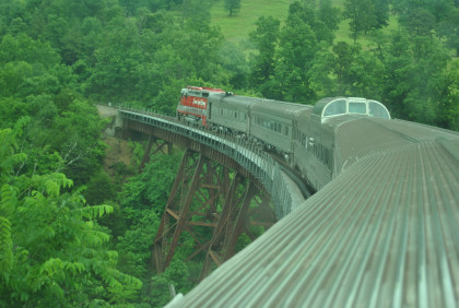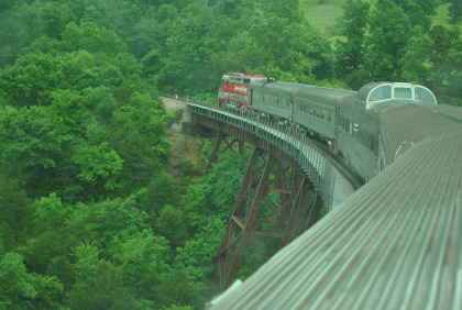 The train crosses Barren Fork Trestle, which is 913 feet long and 125 feet high.