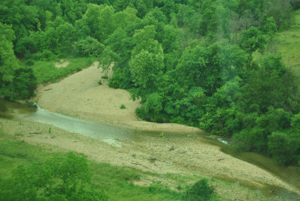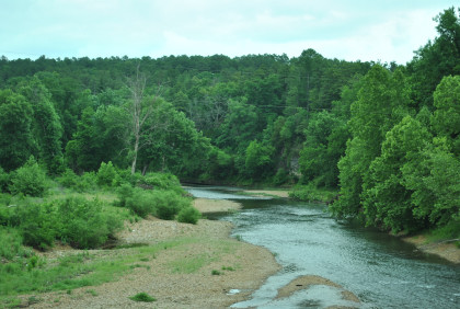 Looking downstream. From here I drove into Springdale, stopped at McDonald's which messed up my hamburger order as they put cheese on it which I cannot eat, then checked into the Executive Inn for my stay here. I then labelled the pictures and did most of the manipulations so Elizabeth could type the travelogue later. I went to the NRHS safety meeting at the Holiday Inn then came back to the hotel, went to Walgreens to get some Off Deep Woods repellent to protect me from tics and chiggers. I returned, there was a knock on my door and Elizabeth typed my travelogue.