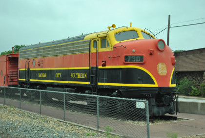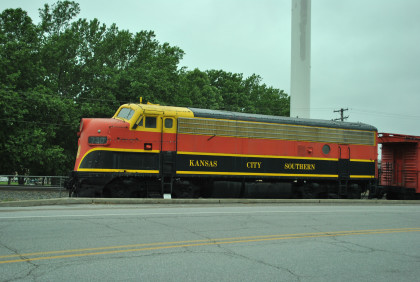 Kansas City Southern F7A 73D built by Electro-Motive Division in 1950. After retirement, it was turned into a slug and retired again then purchased by Peterson Farms and delivered to Decatur in 1991 for restoration.