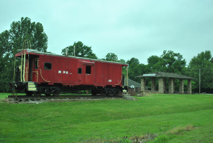 The Missouri and Northern Arkansas passenger shelter and caboose.