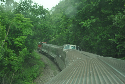 The train takes one of the many curves where one can look out of the front or back of the train and see both ends.