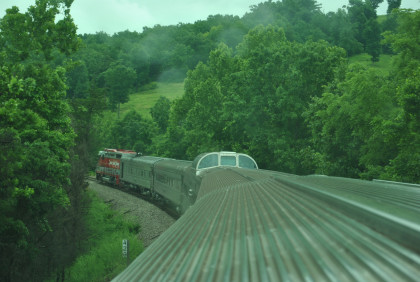 The Branson Scenic Railroad 6/9/2014BSRX F9A 98, ex. Maryland Area Rail Commuter 83, nee Baltimore and Ohio 369, built by Electro-Motive Division in 1951H was on the north end of the train with a consist of BSRX 8336 "Westport", BSRX 8503 dining car "Silver Chief" (former Chicago, Burlington and Quincy), BSRX 9540 "Silver Island" (former Chicago, Burlington and Quincy), BSRX 9320 dome-observation "Silver Terrace" (former Chicago, Burlington and Quincy built by Budd in 1952), parlour car "Casimar Pulaski" (former Pennsylvania Railroad), PPCX 800287 dome-lounge-coach Silver Garden (former Chicago, Burlington and Quincy built by Budd in 1952), PPCX 800603 60-seat coach "Silver Eagle" (former Texas and Pacific built by Budd in 1949), a baggage-dormitory car and BSRX GP30M 99 (former Chesapeake and Ohio built by Electro-Motive Division in 1962).