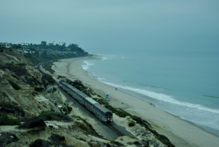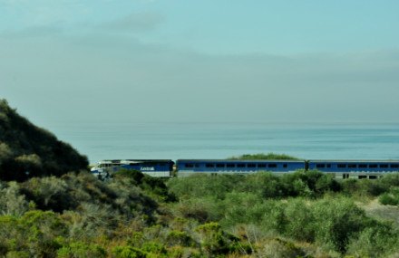 8/11/2014 I arose early and left the house at 6:00 AM, driving to Califia Beach in San Clemente where I paid to park for three hours and walked towards my usual photo spot here. As I was walking, I heard a train approaching from behind.