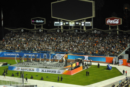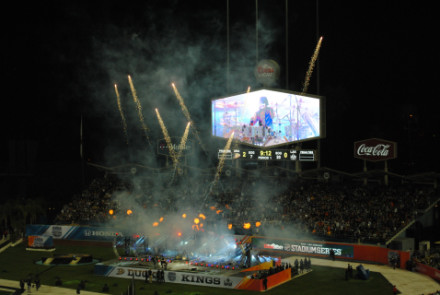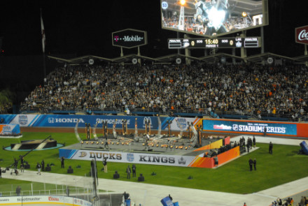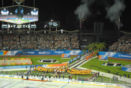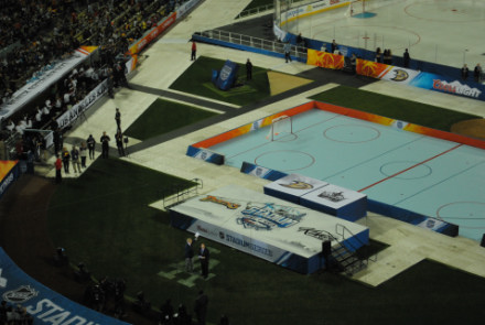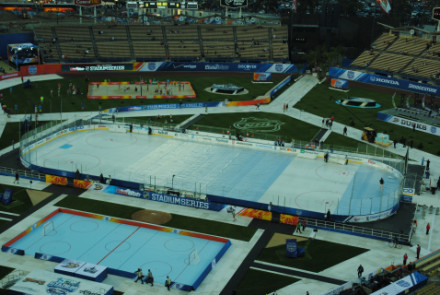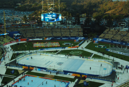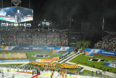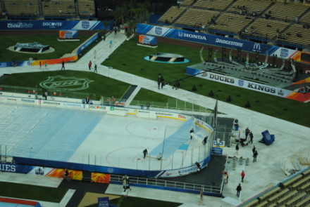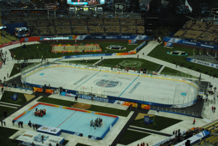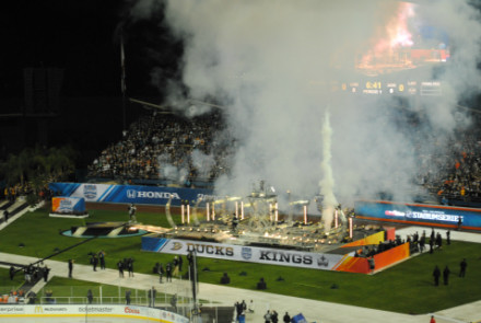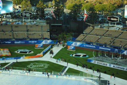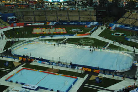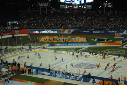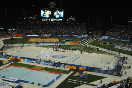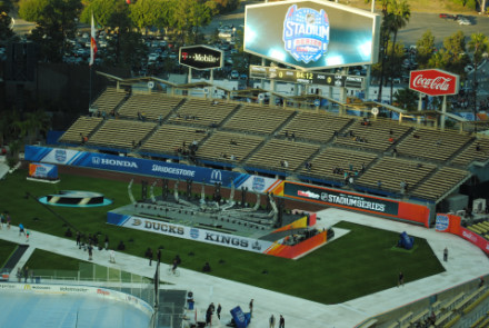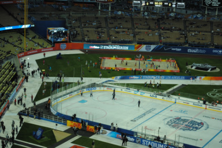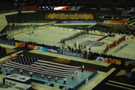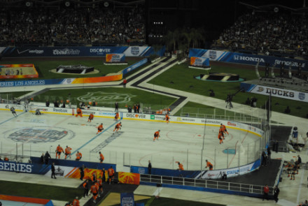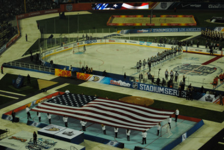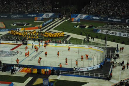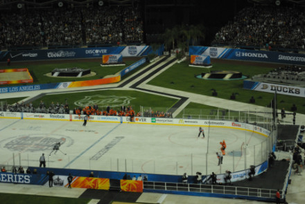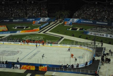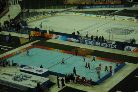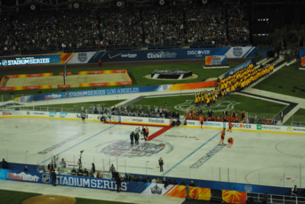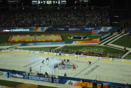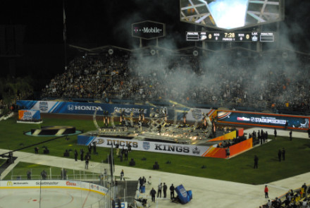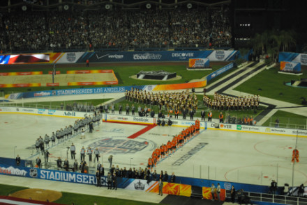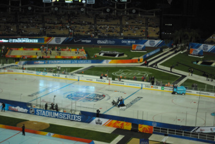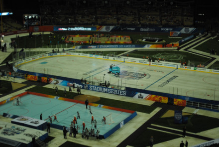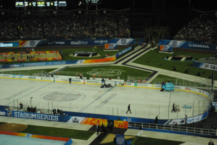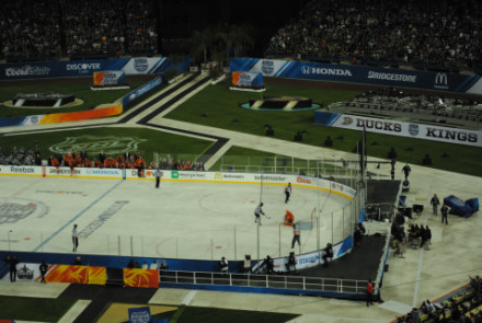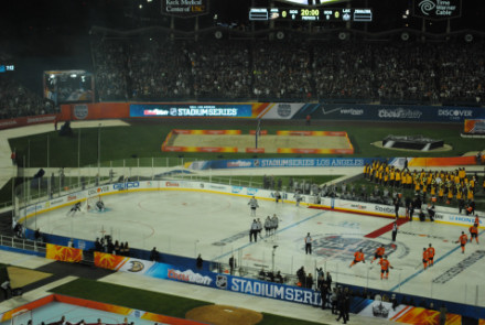 The opening face-off starts this game at Dodger Stadium. At 2:48 of Period One, Corey Perry scored for the Anaheim Duck which was followed by a goal at 8:12 by Matt Beleskey, putting the Ducks up 2-0. Anze Kopitar of the LA Kings was awarded a penalty shot at 8:48 of the first period which was the second penalty shot in the Stadium Series/Winter Classic game history.