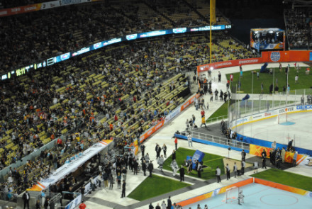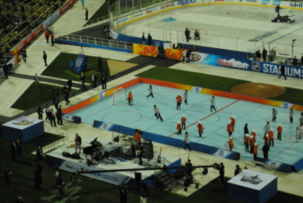 The game ice sheet was still covered to protect it from the direct rays of the sun.