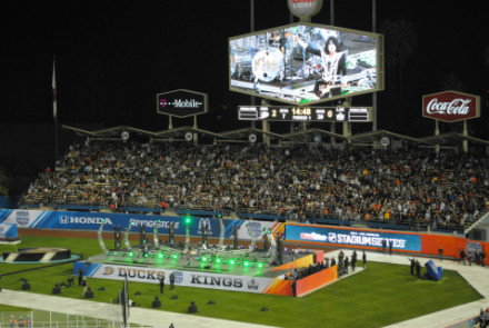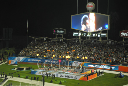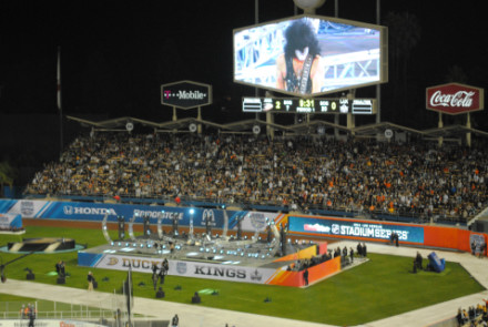 KISS playing on stage at the 2014 Stadium Series at Dodger Stadium.