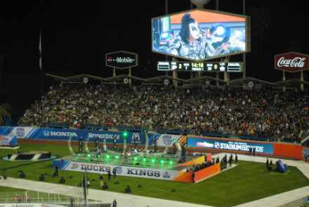 KISS arrived at the back of their stage to be ready to start their pre-game concert.