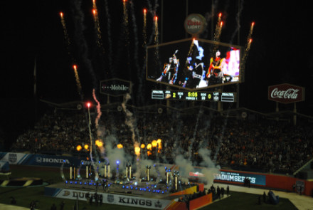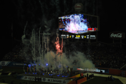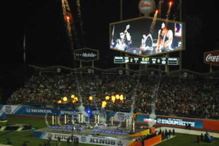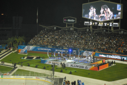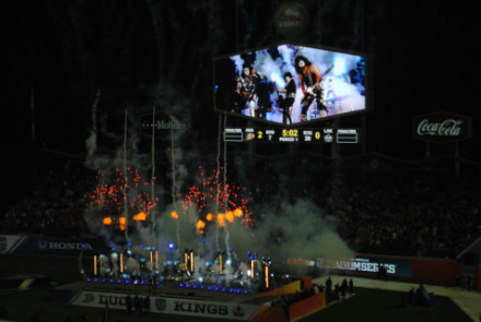 Jonas Hiller stopped the penalty shot by Anze Kopitar and the teams left the ice at the end of the first period with the score Anaheim 2 LA Kings 0. KISS soon returned to their stage starting this set off with "I Love It Loud".