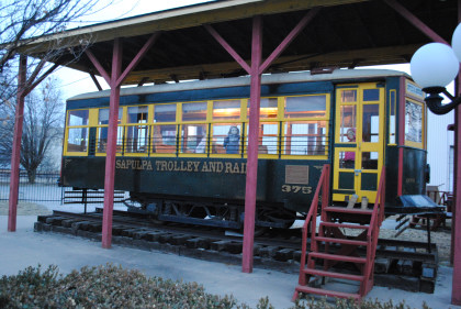 Sapulpa Trolley and Rail Birney safety car 375 built by Wason Manufacturing in 1933. It operated as Tulsa Street Railway 375 from 1927 to 1929 then United Service Company 375 from 1929 to 1933 followed much later by Sapulpa Trolley & Rail 1997-present. It is nicknamed "Maggie M." and lettered Sapulpa Trolley & Rail.