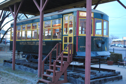 The Frisco station built in 1897 and Santa Fe caboose 999334, built by American Car and Foundry in 1929 as Santa Fe 1844, at Bristow. We took old 66 the rest of the way to Sapulpa and found a trolley and Frisco freighthouse that we would leave until the light of tomorrow. We drove to the Super 8 Motel in Sapulpa, checked in and had an excellent steak dinner at the next door Freddie's Bar-B-Que and Steak House. I would eat here again during the 2014 NRHS convention which would be in Springdale, Arkansas. I worked on the story and called it a night.