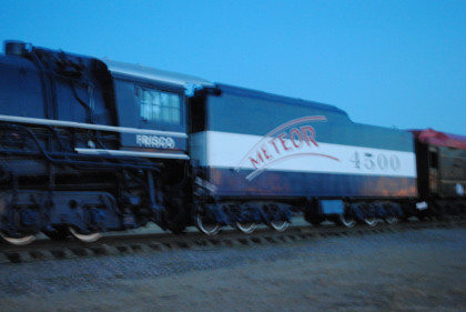 Frisco 4-8-4 4500 built by Baldwin in 1942 and powered the overnight Meteor passenger service from Oklahoma City via Tulsa to St. Louis. 4500 was retired in 1950 and towed to the Frisco Railroad shops in Springfield, Missouri, for a clean-up and re-paint. It was then donated to the City of Tulsa in 1954 and parked in Mohawk Park Zoo until 1991 when it was pulled to the Owasso, Oklahoma rail yard to be renovated. Renovation was slow with most of the work done on weekends by volunteers and it was not until 2011 that work was completed and it was moved to its current location.