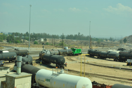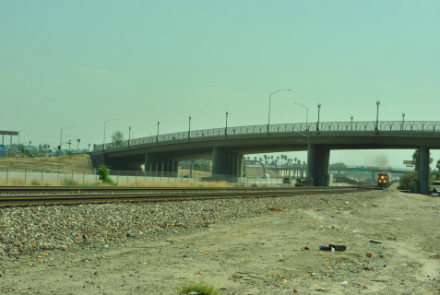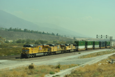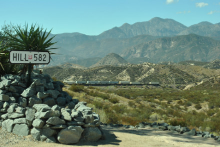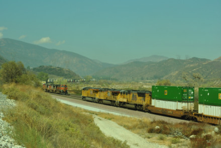 The Southwest Chief with Amtrak 184 trailing came west, after which we returned to the Riverside Freeway and when we reached Interstate 215, we found the freeway closed. It would have been nice if Caltrans had used their freeway signs to tell us about this well in advance. We exited at Center Street after creeping forward for twenty minutes, then went west on East La Cardena Drive back to Columbia Avenue, to Main Street which turns into Riverside Drive, which we took to East Slover Avenue to Pepper Street. Here we found Union Pacific's West Colton Yard strangely dead. We continued to Cajon Pass and Hill 582 but on the way, had a train approaching from behind, so we pulled over and stopped.