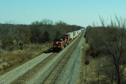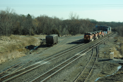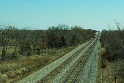 BNSF 6932 West at the bridge just west of Revere. From here we stopped Casey's before getting on US Highway 136 west to Medill.