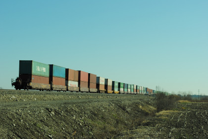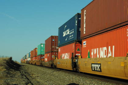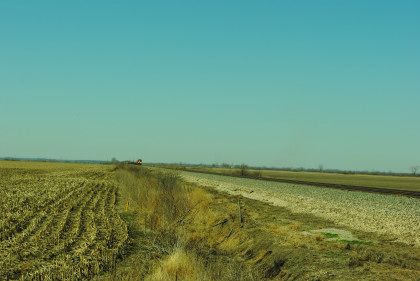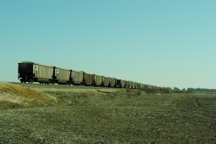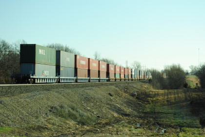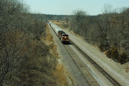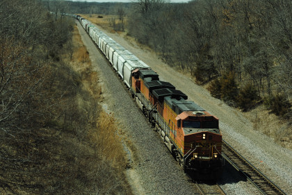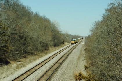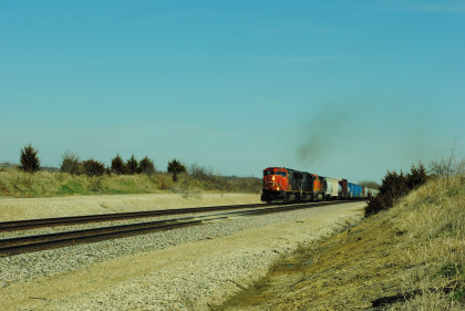 BNSF 6568 East at the Route E bridge. From here we went out to the old bridge west of Gibbs.