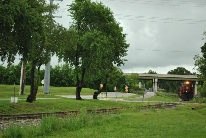Nearing Bentonville Jct. Our train arrived there and once the switch was thrown, we started up the Arkansas & Missouri Railroad Bentonville Branch and my new mileage would begin. This was the first Arkansas & Missouri Railroad passenger train to go up the branch.