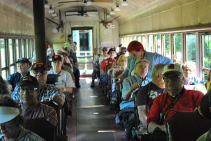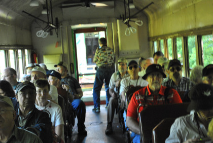 Alabama, Tennessee and Northern Railroad 5 came by our one-car train. My bus passengers boarded the train and we filled it out with some of passengers from the other bus so left with almost a full car. I gave my safety briefing then we departed Eureka Springs.