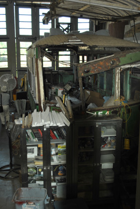 Car 6 is a single truck arched roof 10-bench open car built by Brill in 1906 from Vera Cruz, Mexico under restoration.