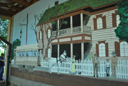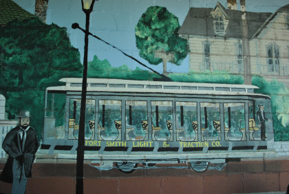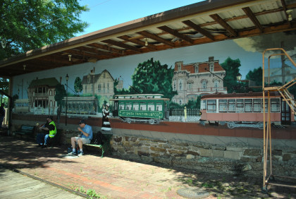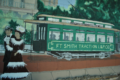 There is a very nice trolley mural on the wall which local artist John Bell, Jr. designed in 1990, and directed a team of his art students in painting it. The mural depicts the 50-year heyday of street railway transportation in Fort Smith, beginning with the mule-drawn streetcars of 1883, on the far left. The second car shown is an open car, in which the motorman stood outside. After that came the semi-convertible trolley and, on the far right, the Birney "safety car," which was used until Fort Smith Light & Traction Co. closed in 1933. Four historical buildings are shown in the background, including Fort Smith's W.H.H. Clayton house and the Fort Smith Art Center.