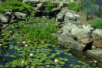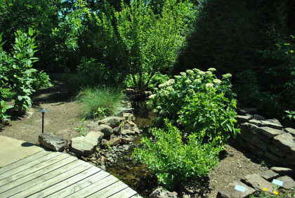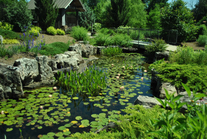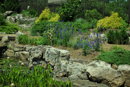 The Rock and Water Garden. A large berm, fieldstone wall and gatehouse separate the public entry from the Rock and Water Garden, which depicts an Ozark mountain stream with grotto effect, waterfalls and pools of water one might see in the mountains. Turtles, frogs and various water plants live in the pools. This garden utilizes custom-blended soils for growing various specialized rock garden plants. The rock featured in this garden is sandstone from the Winslow area.