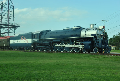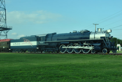 Frisco 4-8-4 4500 built by Baldwin in 1942 and powered the overnight Meteor passenger service from Oklahoma City via Tulsa to St. Louis. 4500 was retired in 1950 and towed to the Frisco Railroad shops in Springfield, Missouri, for a clean-up and re-paint. It was then donated to the City of Tulsa in 1954 and parked in Mohawk Park Zoo until 1991 when it was pulled to the Owasso, Oklahoma rail yard to be renovated. Renovation was slow with most of the work done on weekends by volunteers and it was not until 2011 that work was completed and it was moved to its current location.