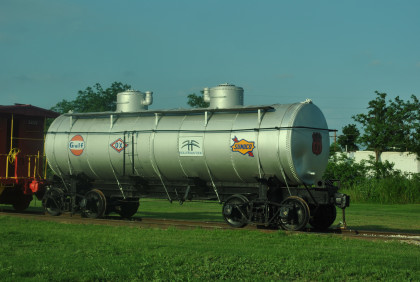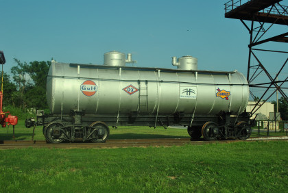 Cosden double-dome tank car built in 1917 which has been hand-painted and logos of the various oil companies related to Tulsa's rich history have been reproduced on the sides.