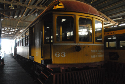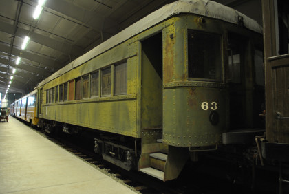 Petaluma and Santa Rosa Railroad double-end, double-truck wooden combination baggage and interurban car with clerestory roof 63 built by the Holman Car Company in San Francisco in 1904. It ran between Petaluma, Sebastopol and Santa Rosa with a branch to Forestville. Passenger service on the railroad ended in 1932 and this car was dismantled. The car body was used as part of a house in the hills west of Fairfield until it was acquired by the Association in August 1967 and moved to the Museum on November 27, 1967. Members of the Association tore down the house to get the carbody out of it.