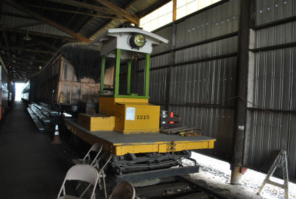 Key System Railroad shop switcher 1215 built by the railroad in 1899 and rebuilt in 1926. It was probably built from parts salvaged from other cars. It was used to tow cars around the shops, and was moved to the Museum in April 1963.