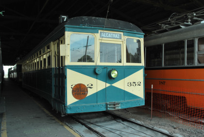 East Bay Street Railways wood-and-steel, double-end, double-truck, arch-roof streetcar 352 built by the St. Louis Car Company in 1911. It was used in streetcar service in the East Bay Area until 1948. It was heavily rebuilt over its life and has had several different corporate ownerships, but it always used in the same service area. These ownership changes resulted in many different paint schemes and names being on the car over its lifetime, but it always retained the same number. When the car was retired, it was stripped of electrical and mechanical equipment and used as a storage shed behind a house in the Berkeley hills. The car was restored in the Museum's shop to its current operating condition in 1985, using parts acquired all over the world. The car is currently in its 1931 appearance.
